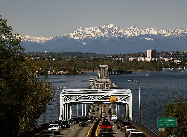 A view from the 79th Street NE overpass in Medina, looking west across the Evergreen Point bridge with the Olympic Mountains unusually clear in the background.