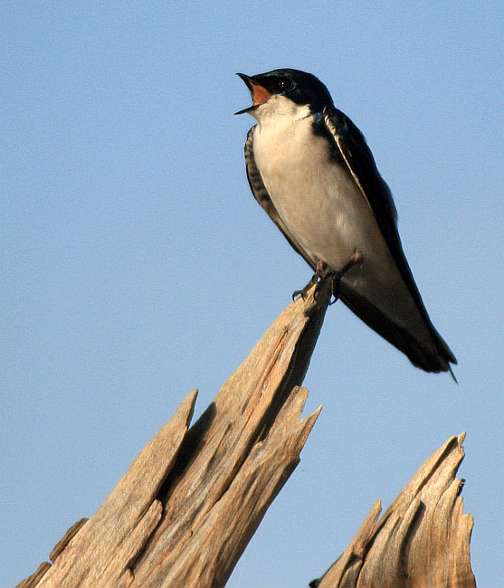 | A barn swallow taking a break from his swooping and swerving aerobatics to catch his breath on a snag |