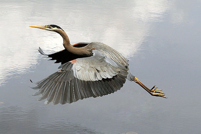 | A Great Blue Heron flying across the lagoon at Juanita Bay Park |